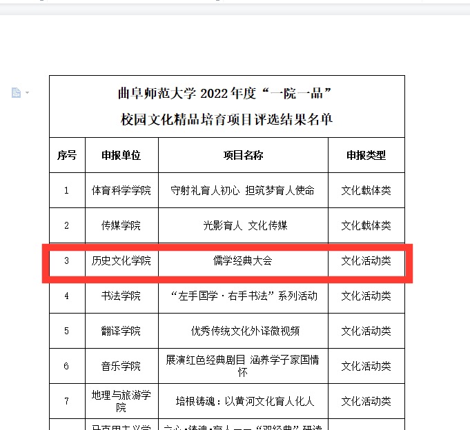 为深入推动全国文明校园及“中华优秀传统文化传承示范校”建设,切实提升我校立德树人工作水平,我校于9月启动“一院一品”校园文化精品项目的申报评选,成人短视频 积极参与,经过自主申报、专家评审等程序,成人短视频 “儒学经典大会”成功入选2022年度“一院一品”校园文化精品培育项目。