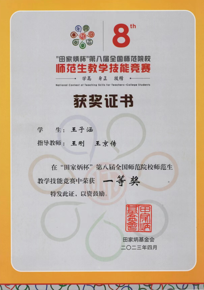 4月16日,“田家炳杯”第八届全国师范院校师范生教学技能竞赛决赛在浙江师范大学落下帷幕。成人短视频 2020级历史学(师范)3班学生王子涵(指导教师:王刚、王京传)荣获一等奖,创成人短视频 学子参加该赛事以来的最好成绩。