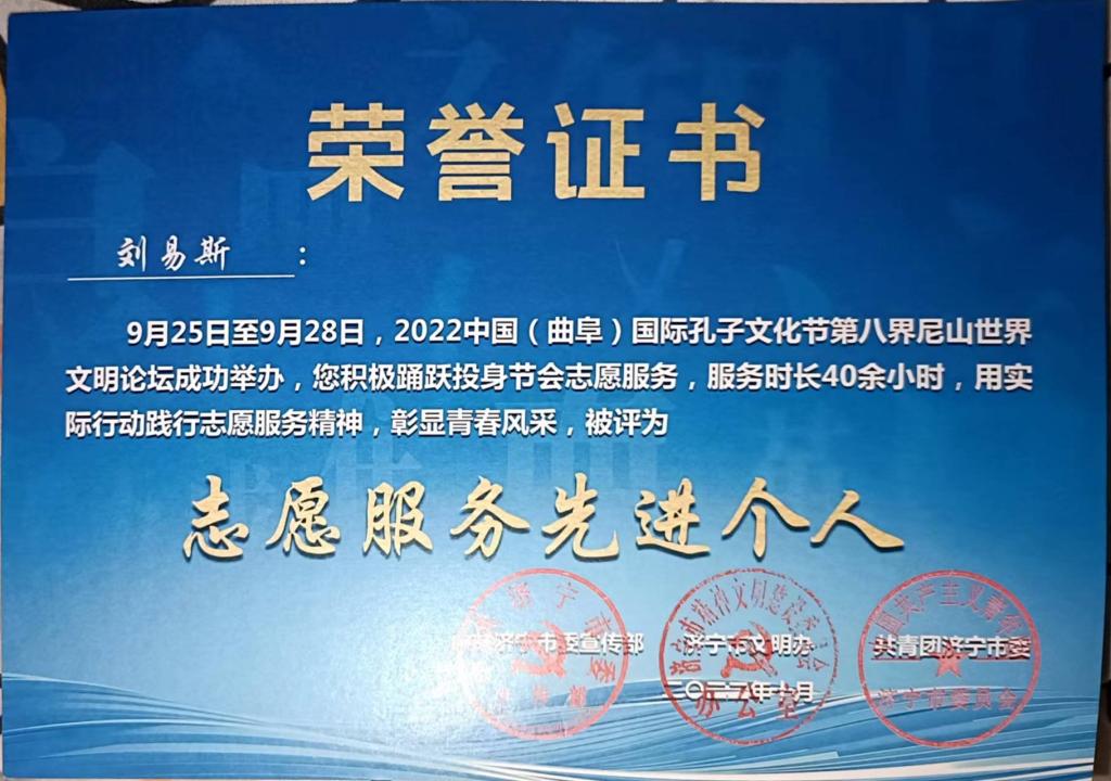 为增强儒家文化的影响力,传承五千年中华文明,9月27日,2022中国(曲阜)国际孔子文化节第八届尼山世界文明论坛在孔子诞生地曲阜尼山举办,成人短视频 学子积极参与,共有24名同学在本次活动中荣获“志愿服务先进个人”称号。