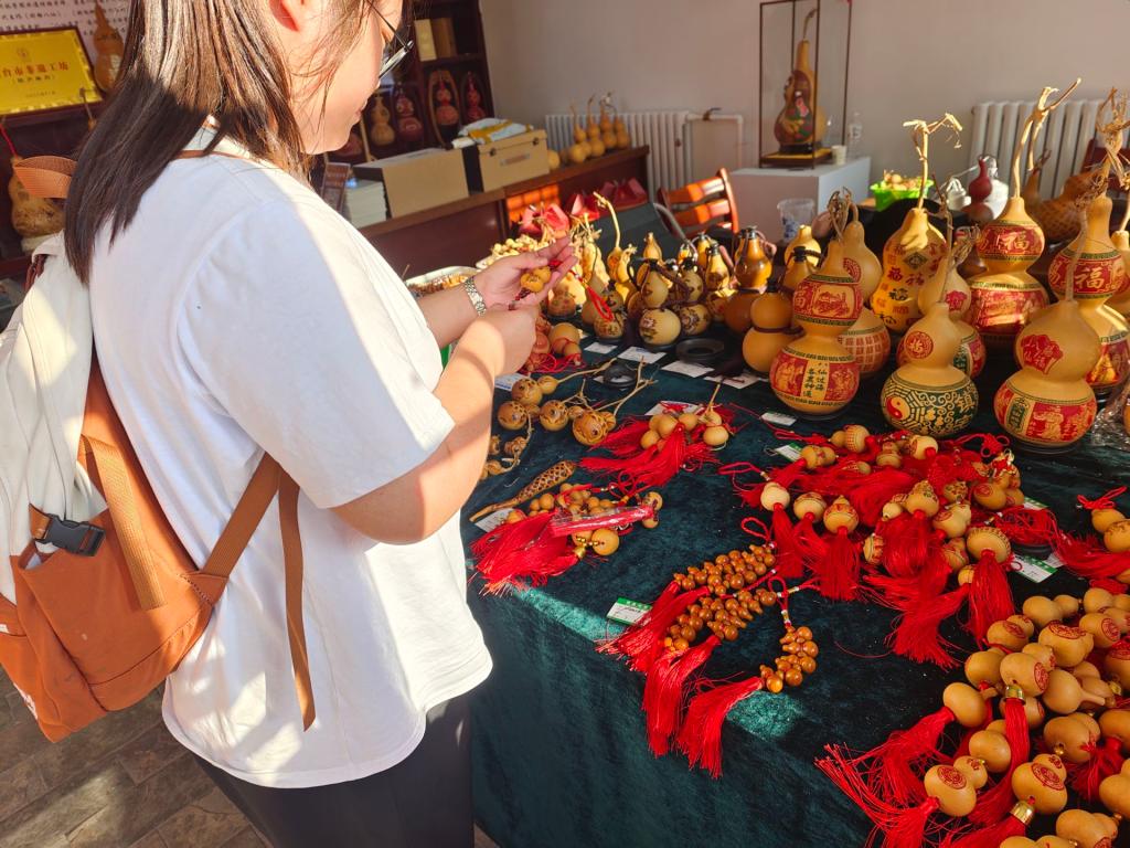 为了更好地研习非物质文化遗产葫芦雕刻,实践队员去往当地非遗的制作工坊参观了一些精致的葫芦雕刻成品。这些成品以其精湛的工艺和独特的设计吸引了实践队员的注意,实践队员仔细观察每一个作品,并与工坊的店主进行了深入交流。店主向实践队员介绍了葫芦雕刻的制作过程、技巧和灵感来源。他们还分享了一些关于传统文化和葫芦雕刻的故事,这些宝贵的经验分享使实践队员更加深入地了解了理解葫芦雕刻的价值和意义和当代艺术家的创新精神。