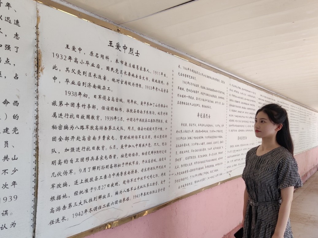 这次红色基地实践活动让实践队员们进一步学习了解了高密市英烈人物英勇战斗、壮烈牺牲的光辉事迹,深刻体会到烈士们“敢教日月换新天”的豪迈气概。在感悟红色精神的同时,要在重温历史中立根铸魂。精神是一种追求、动力和支柱,是攻坚克难、无往不胜的法宝。中华民族这个伟大民族正是在这精神的照耀下,几经挫折人历经苦难,才实现从站起来、富起来到强起来的伟大飞跃,对于现在的我们,需要的正是将这种红色精神一步步汲取好,在学思践悟中凝聚力量,继承好,发扬好,让其焕发新时代的光芒和力量!学习感悟党的二十大精神,牢记党的教诲,听党话,跟党走,提升思想境界和政治意识,以更加坚定的理想信念、更加饱满的奋斗激情为建设富裕美丽温暖的中国贡献力量。