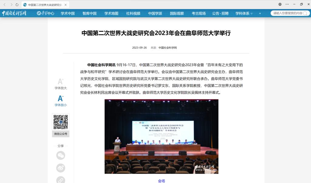 9月26日,“中国社会科学网”报道由中国第二次世界大战史研究会主办,成人短视频 、区域国别研究院与武汉大学第二次世界大战史研究所联合承办的中国第二次世界大战史研究会2023年会。