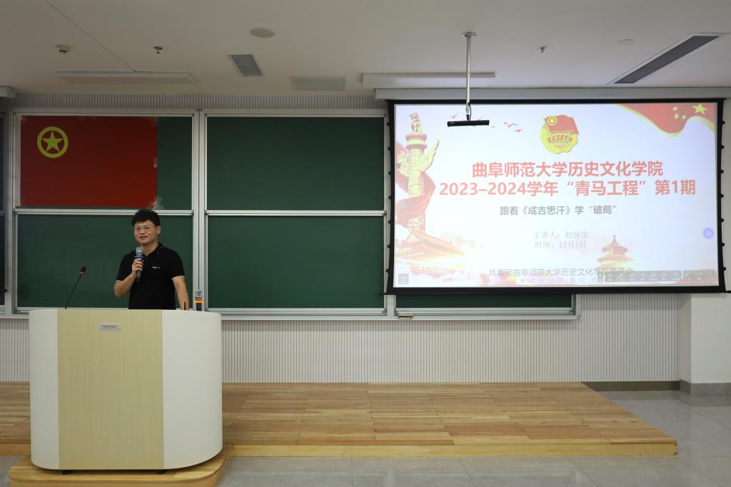 伴随着国歌的奏响仪式拉开帷幕。王建阳老师发表讲话,对学生干部表达了殷切的希望,并为赵怀宝老师颁发了聘书。学生会副主席步玫霖作为学员代表宣誓,表示会珍惜培训机会,做青年马克思主义骨干。开班仪式结束后,赵怀宝老师为同学们带来以“跟着《成吉思汗传》学‘破局’”为题的青马工程首场讲座。他指出,“破局”的成功之处在于要拥有根据地思维,能实事求是地定位自己,要“相信你所相信的看到,终将看到你所相信的相信。”之后,对于学生干部们在大学期间的问题,赵怀宝老师也一一为同学们作了细心且耐心的解答。