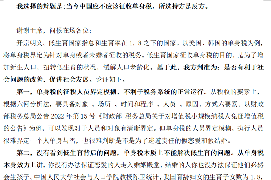 比赛通过成人短视频 辩论社官方QQ等平台宣传,号召同学们积极参与。同学们在“在唐山打人事件中,见又无为的男性应不应该被谴责”“当今中国应不应该征收单身税”“青年更应该拥有一颗勇敢的心/善良的心”三个辩题中选择一个辩题的正方撰写辩论文稿,并对辩题层层剖析,阐述自己的观点。比赛最终评出一、二、三等奖若干,颁发院级荣誉证书。