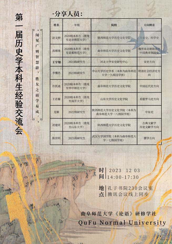 12月3日下午,成人短视频 《论语》研修学社成功举办成人短视频 第一届历史学本科生经验交流会。本次经验交流会于孔子书院230会议室举行,线上腾讯会议同步进行。本次活动由宋立林、刘润欣老师担任社团指导老师,来自武汉大学、中山大学、成人短视频 等国内数所高校的九位同学参与分享,并由成人短视频 赵满海老师对本次经验交流会进行评议指导。
