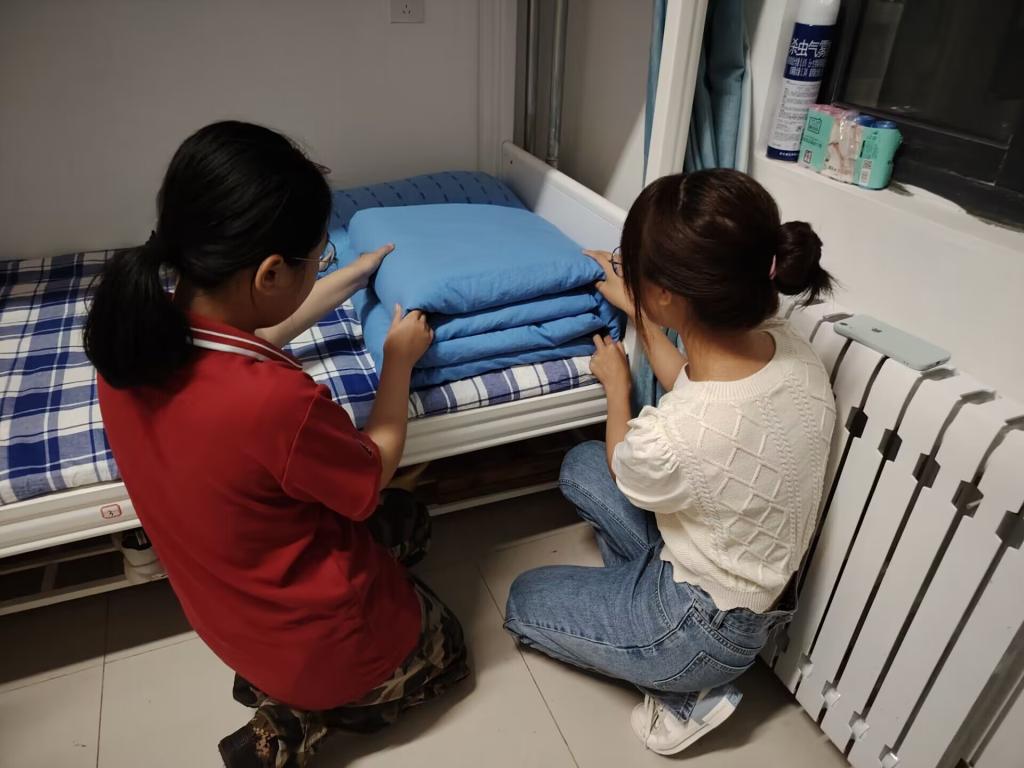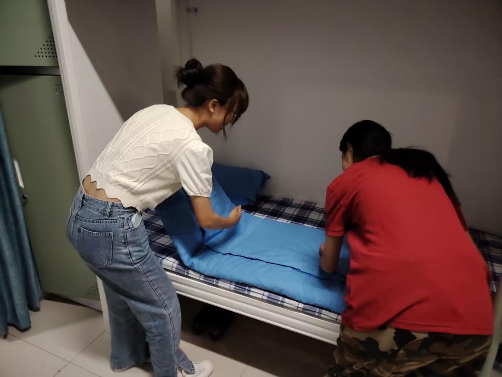 志愿者们进入宿舍首先和新生们进行了简单的交流和沟通,让23级新生们感受到来自成人短视频 师哥师姐们的热情,志愿者们在宿舍宣讲关于宿舍卫生、宿舍纪律以及一些红线问题,并亲自教新生如何叠豆腐块、如何平整床铺以及被子枕头的正确摆放。
