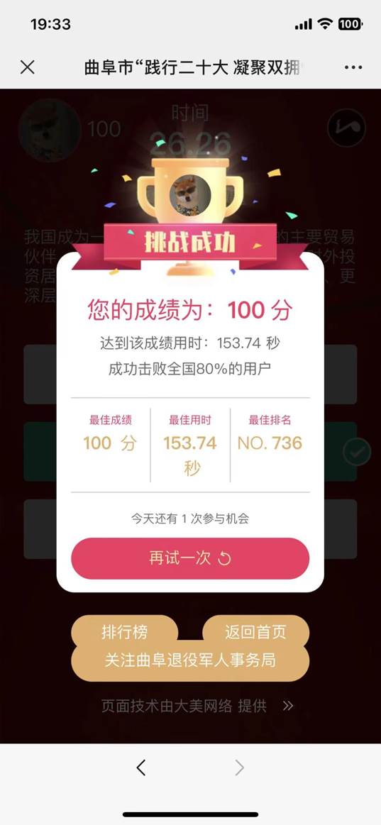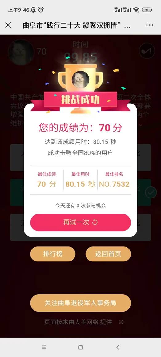 为支持国防和军队建设,普及国防双拥知识,增强双拥工作活力,增强新时代双拥共建工作的使命感、责任感,3月14至4月14日,成人短视频 积极参与曲阜市“践行二十大凝聚双拥情”双拥知识竞赛答题活动。