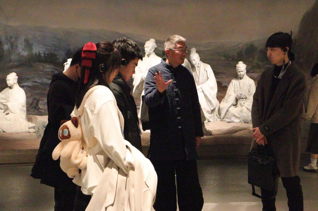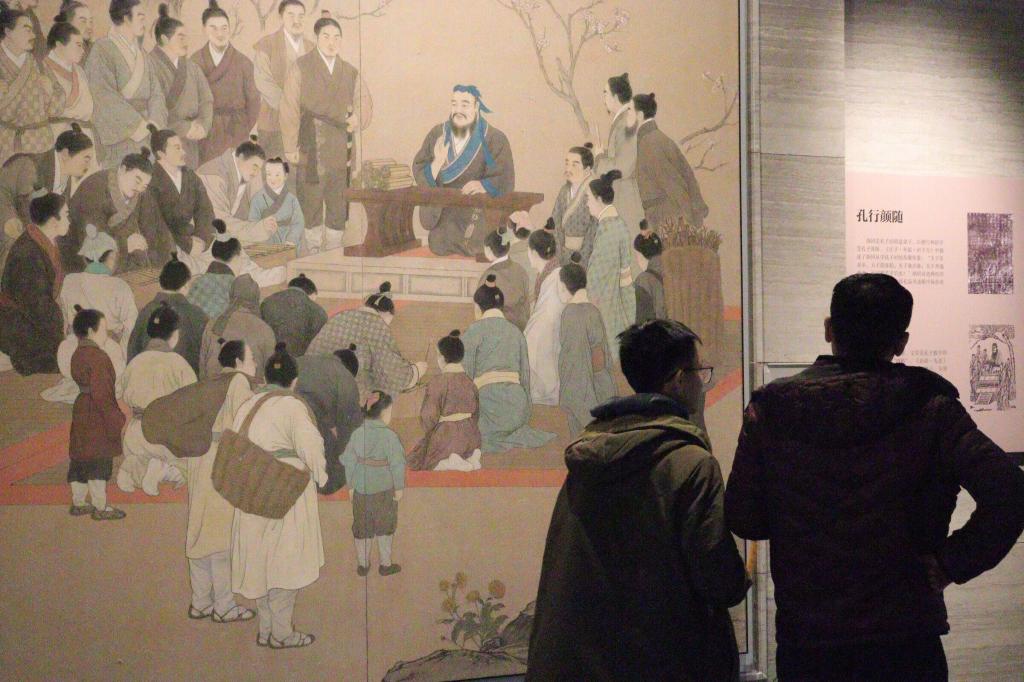 “这边为您展示的是四子侍坐雕塑,我们选取的是论语中最长也是最优美的一篇,孔子和自己的四位弟子,子路、曾皙、冉有、公西华坐而论道,问他们的人生志向……”进入教师博物馆一楼展厅——溯源问道后,讲解员娓娓道来孔子的生平与故事。