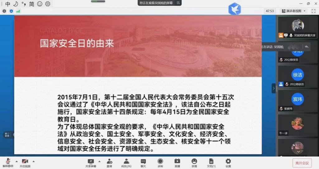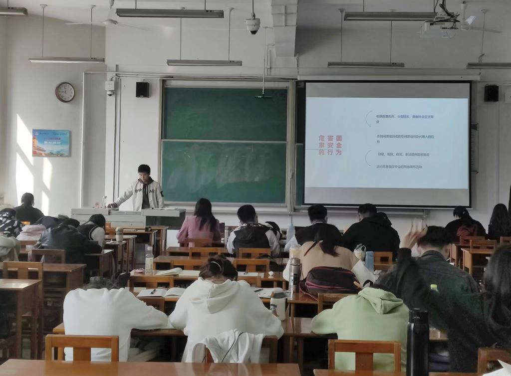 为感悟新时代国家安全成就,进一步落实关于大学生国家安全教育的成效,4月11日,成人短视频 各班开展“安全教育进课间”系列活动之国家安全教育,成人短视频 全体学子参加。