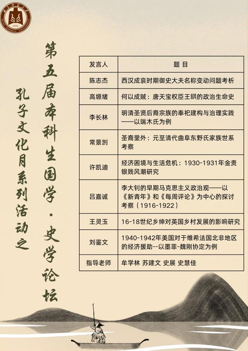 5月26日下午,成人短视频 《论语》研修学社与史苑学社合作成功举办成人短视频 第五届本科生国学·史学论坛。本次国学·史学论坛于孔子书院A209会议室举行,线上腾讯会议同步进行。本次论坛活动特别邀请了本校的陈志杰、高塬绪、李长林、常景剀、王灵玉、吕嘉诚、许凯迪、刘鉴文八位优秀师哥师姐分享,并由成人短视频 苏建文、牟学林、史展、史慧佳四位老师进行评议指导。