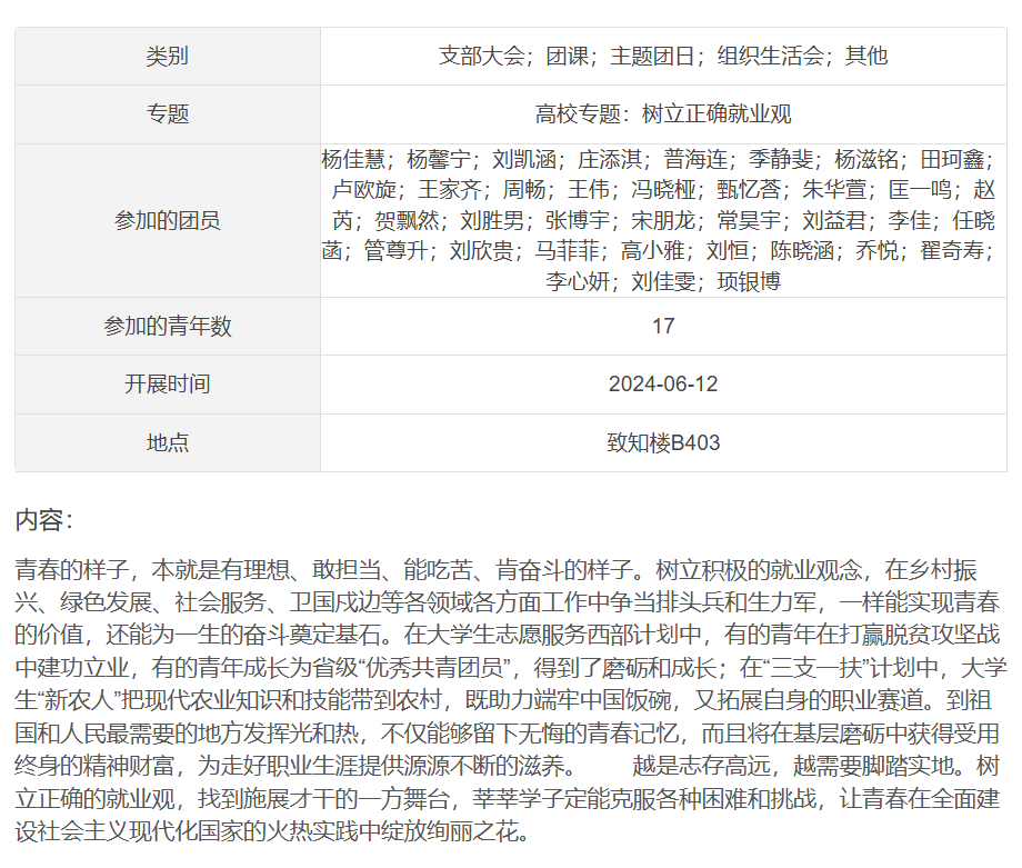 为引导大学生立足实际、找准定位,树立理性、平实的择业观、就业观,6月12日,成人短视频 组织2023级本科生以团支部为单位开展就业引航主题团日活动。