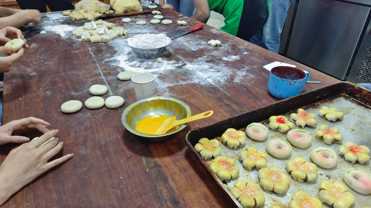 这一次参观,实践队员有幸来到了孔府糕点的制作后厨,在有经验的周老师带领下学习如何制作孔府糕点。从面团、馅料的准备开始,从无到有体验这一传统糕点的制作。在后厨忙碌的过程中,实践队员逐渐静下心来,简单的鸡蛋、面粉和时令水果馅料,在周老师和实践队员手中逐渐变成了朵朵盛开的花朵和可人的苹果甚至惟妙惟肖的兔子、锦鲤。片刻等待之后,实践队员亲手做的糕点出炉,后厨的所有人员共同分享了这一份甜蜜。实践队员还采访了周老师,从周老师的话语中得知,她坚持制作孔府糕点已经50多年了,这道传统的点心没有任何添加剂,她一直使用的都是纯天然食材,就连馅料也是随季节变化的时令水果。这也是符合了儒家“中庸”与“节制”。小小的后厨,也蕴藏着孔子思想。