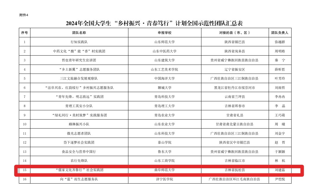 近日,2024年全国大学生“乡村振兴·青春笃行”计划全国示范性团队遴选结束,成人短视频 “儒家文化齐鲁行”社会实践团在众多高校志愿服务团队中脱颖而出,成功入选。