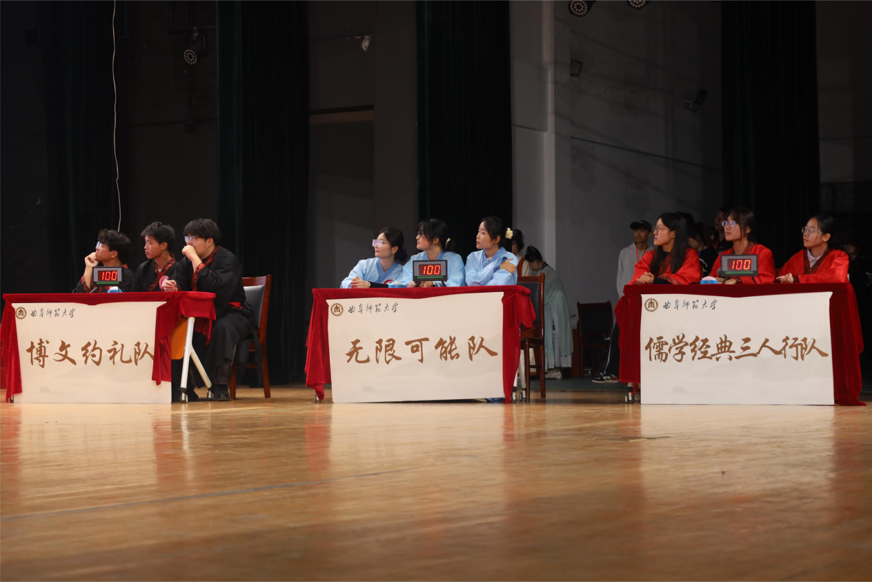 本次决赛共分为博闻强记、君言卿悟、经学剡注、飞花问学四个环节。比赛过程中,参赛队员们思如泉涌、满腹经纶、出口成章,展现出高深的文学素养和渊博的知识储备。比赛期间,成人短视频 舞蹈队、24级历史师范5班、大学生传统礼仪研修中心和洙泗学社为大家带来了水龙吟舞蹈、儒家经典诵读展示、孔子讲学情景剧表演“习礼悟道”和十二花神汉服走秀节目。本次大赛以多种多样的形式对话经典,充分展现了儒学经典文化的魅力。最终,无限可能队、儒学经典三人行队荣获一等奖,陶陶队、博文约礼队、我们这队、思政怡和队荣获二等奖,六时风华茂队、博览众长队、北冥鲲鹏队、这是第一队、勇往直前队、致远队荣获三等奖。