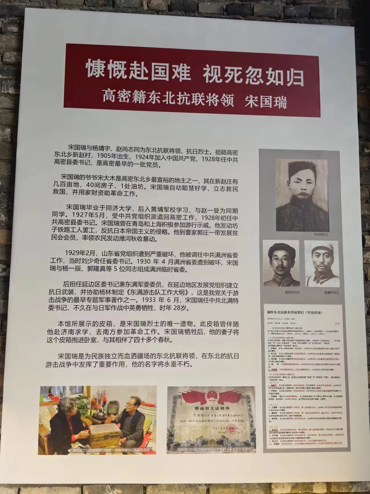 在追寻文学脉络的同时,实践队不忘探寻高密的红色历史,缅怀英雄宋国瑞烈士。队员们来到宋国瑞烈士纪念馆,馆内陈列的珍贵文物和历史资料,生动地展现了烈士的英勇事迹。宋国瑞出生于高密,在革命年代,他积极投身反帝反封建斗争,为了民族独立和人民解放事业,不惜抛头颅、洒热血。1927年,他参与领导了高密的农民武装起义,虽最终起义失败,但他的英勇行为激励了无数后来人。
