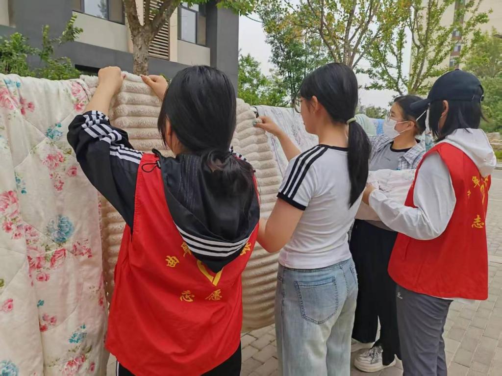 为切实解决同学们公共晒晾区“一位难求”的困扰,6月7日,成人短视频 学生会于5号楼和6号楼之间开展“晒被日”暖心服务活动,着力为同学们营造规范有序的晾晒环境。
