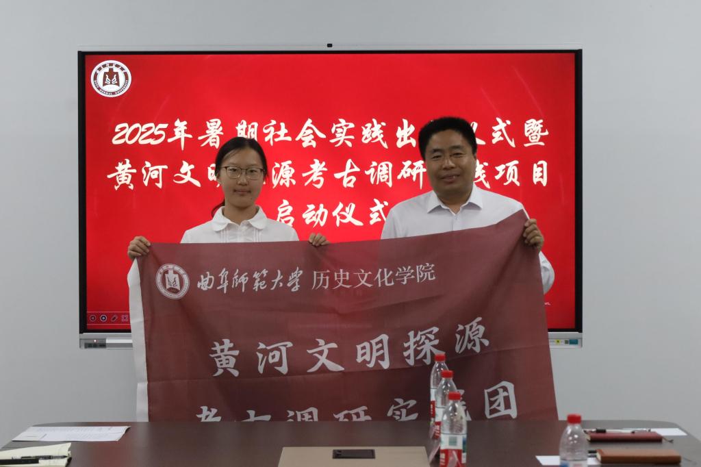 仪式伊始,王建阳充分肯定了学院历年社会实践取得的丰硕成果,强调了实践育人的重要意义,叮嘱大家在实践中注重安全、协调配合,以扎实行动增强活动实效。随后,吕厚轩宣读了2025年国家级志愿服务团队立项名单,为实践工作指明了方向。陈德洋详细介绍了黄河文明探源考古调研实践项目的具体实施方案,为参与师生明确了工作目标和实施路径。学生代表王锦涛作表态发言,表达了青年学子投身实践、探索求知的坚定决心。最后,在授旗环节中,孔轶众与姜开勇共同为国家级社会实践代表队授旗,王京传为学院重点实践队伍授旗,正式拉开了2025年暑期社会实践活动的帷幕。