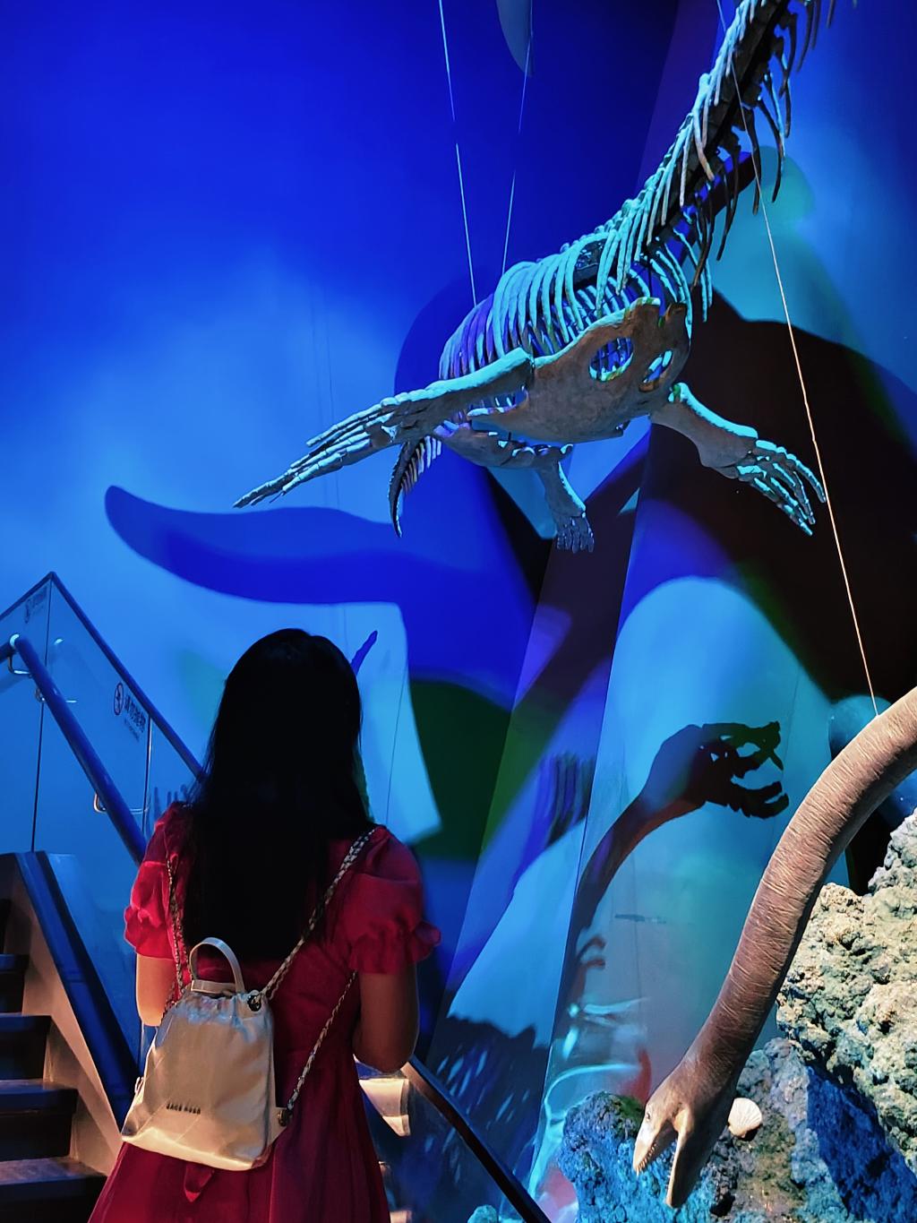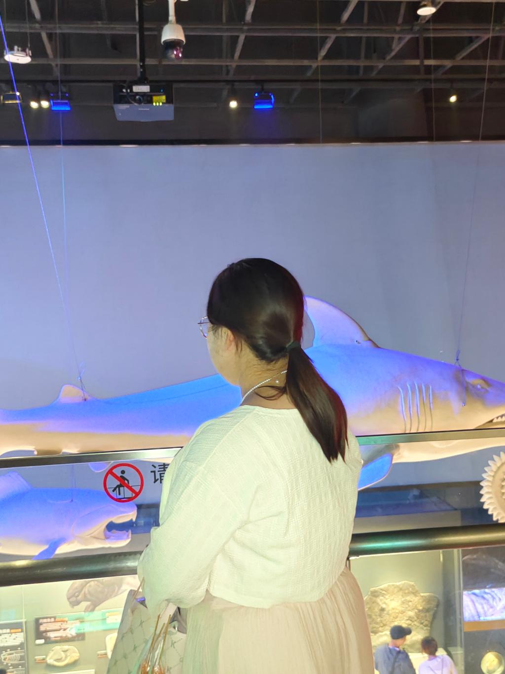 天津国家海洋博物馆坐落于滨海新区,是我国唯一的国家级综合性海洋博物馆,被誉为“海上故宫”。实践队员们首先步入“远古海洋”展厅,巨大的蓝鲸骨架模型悬挂在穹顶,周围陈列着数亿年前的海洋生物化石。讲解员指着一块长约2米的直角石化石介绍:“这是4.5亿年前的海洋霸主化石,当时的华北地区还是一片古海洋。”实践队员们俯身观察化石表面的纹路,在展板上的古地理图中寻找如今中国海岸线的雏形,直观感受到海洋疆域的历史变迁。展厅出口处的电子屏循环播放着我国海域面积示意图,标注着300万平方公里蓝色国土的范围,队员们纷纷驻足记录。