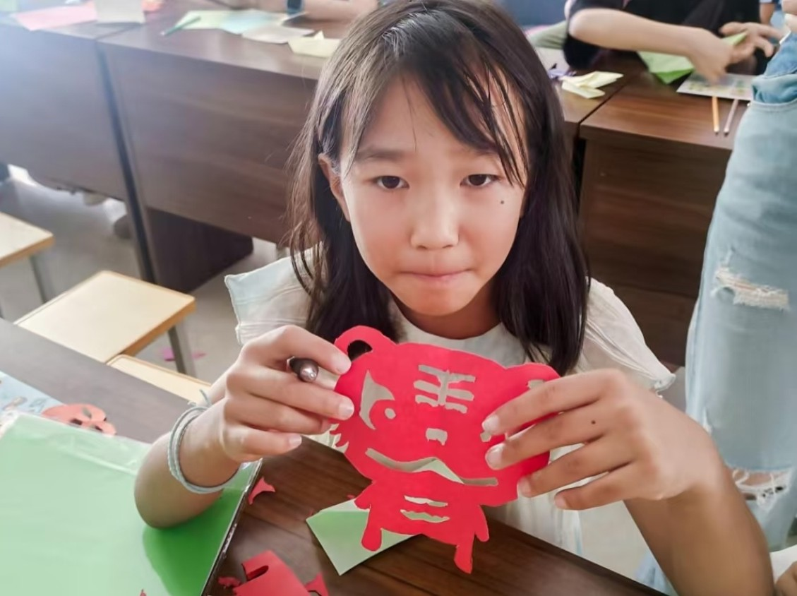 高年级组的孩子们则挑战难度更高的“连续剪花边”和生肖图案。10岁的刘思琪在队员张子晗的指导下,先在卡纸上画出小兔子的轮廓,再小心翼翼地沿着线条裁剪,当毛茸茸的兔子耳朵从纸中“跳”出来时,她开心地举起来向同伴展示:“你们看,我的小兔子有长长的耳朵!”活动现场,彩纸的沙沙声与孩子们的欢笑声交织在一起,原本普通的卡纸在小手中逐渐变成栩栩如生的生肖形象、绽放的花朵、灵动的蝴蝶。