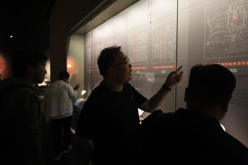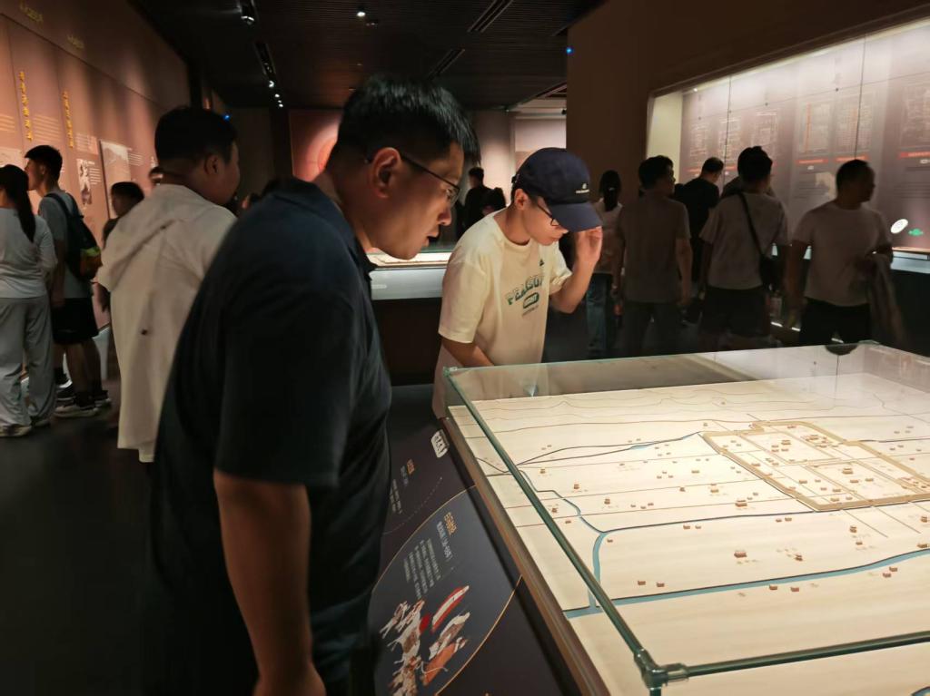 站在阊阖门遗址模拟展示台上,队员们手抚殿基础坑,想象当年帝王登基的盛况。从阙门到太极殿,南北轴线串联起整座宫城。这种“建中立极”的布局,将黄河‘天下之中’的理念化为实体,影响后世千年。通过数字建模展示,队员们清晰看到了宫城如何精确规划在古洛河1.5公里外的安全距离,深刻理解了古人“择天下之中而立国”的地理智慧与防洪智慧。