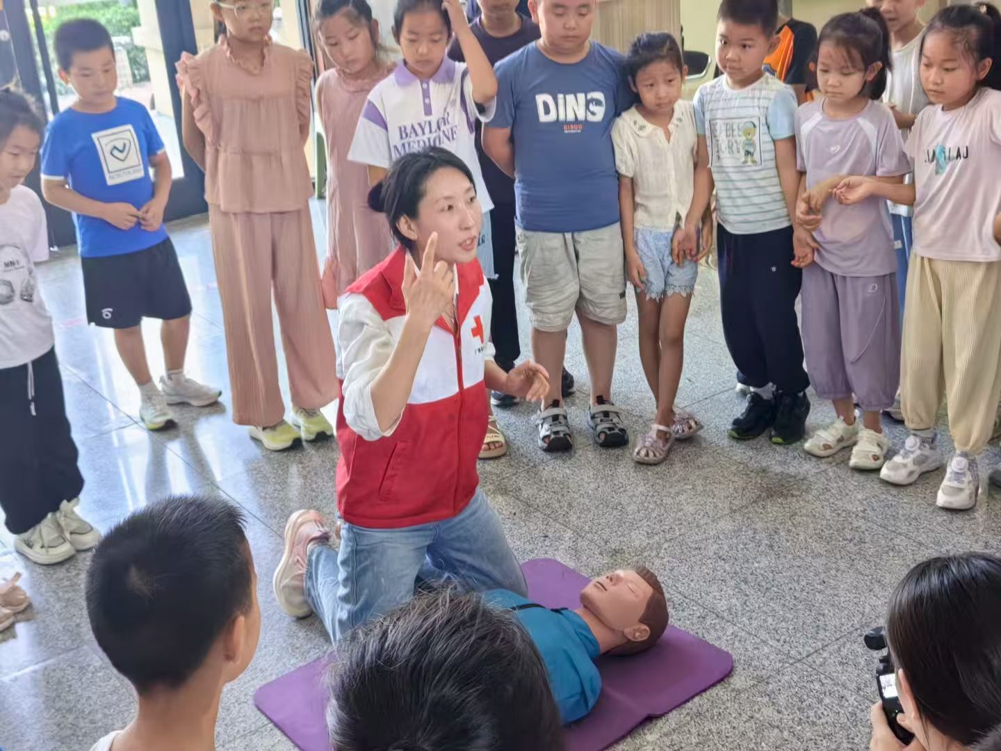 溺水救援与心肺复苏、人工呼吸教学现场,红十字会讲师与志愿者默契配合。讲师跪在模拟人旁,一边演示胸外按压,一边讲解:“按压深度要达到 5 - 6 厘米,频率保持 100 - 120 次 / 分钟,节奏要稳定 。” 孩子们围在周围,眼睛一眨不眨地学习。到了实操时刻,他们踊跃参与,在讲师和志愿者的指导下,认真完成每一个动作。尽管有些孩子的动作还稍显稚嫩,但这份对生命救援技能的探索,格外珍贵 。