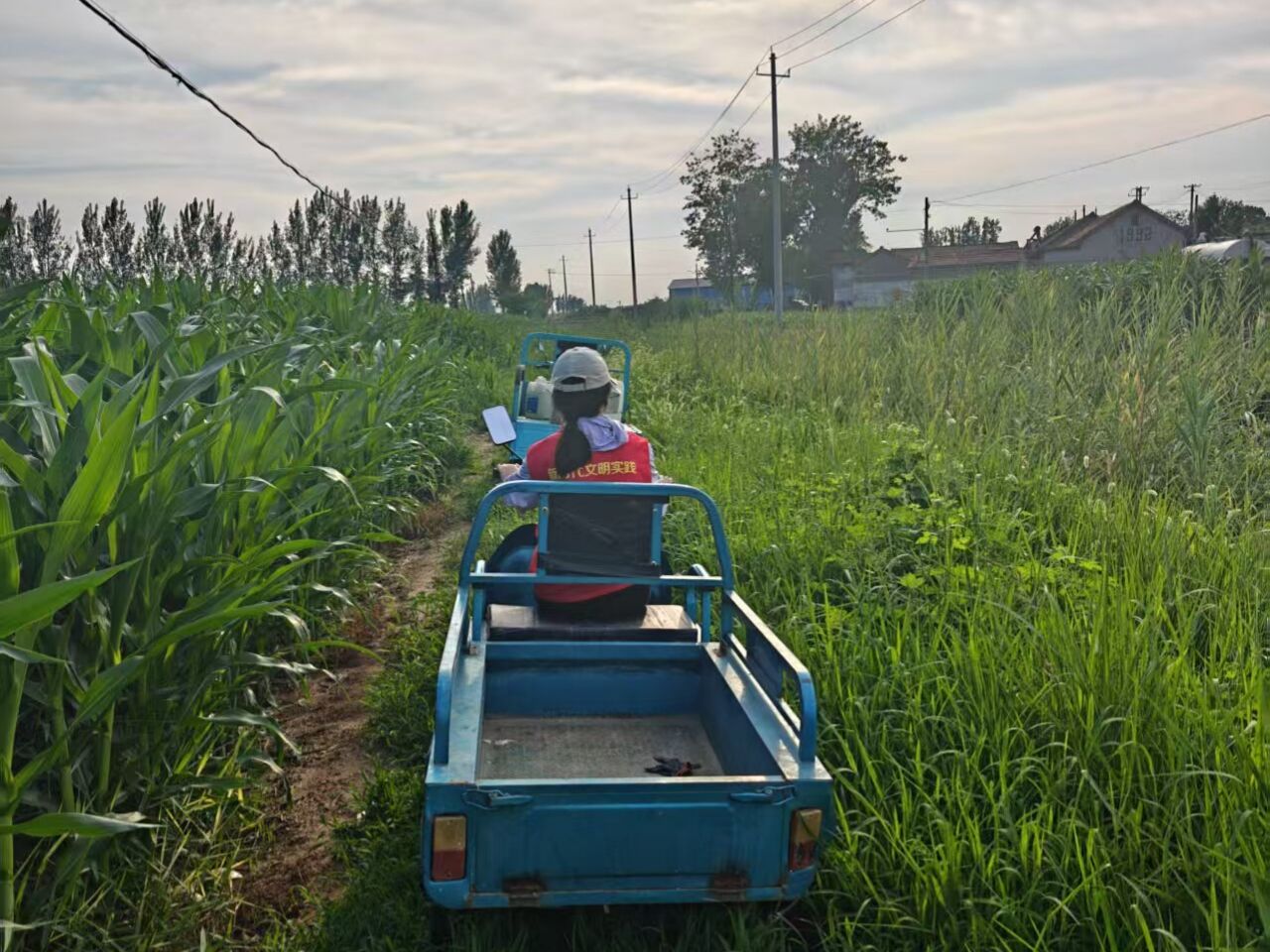清晨的乡村还浸在薄雾中,实践队员便已来到农户家中。当天的首要任务是将存放于村口仓库的农药转运至麦田旁。农户家的三轮车虽不算崭新,却擦拭得干净,车斗里早已备好防滑的麻袋。