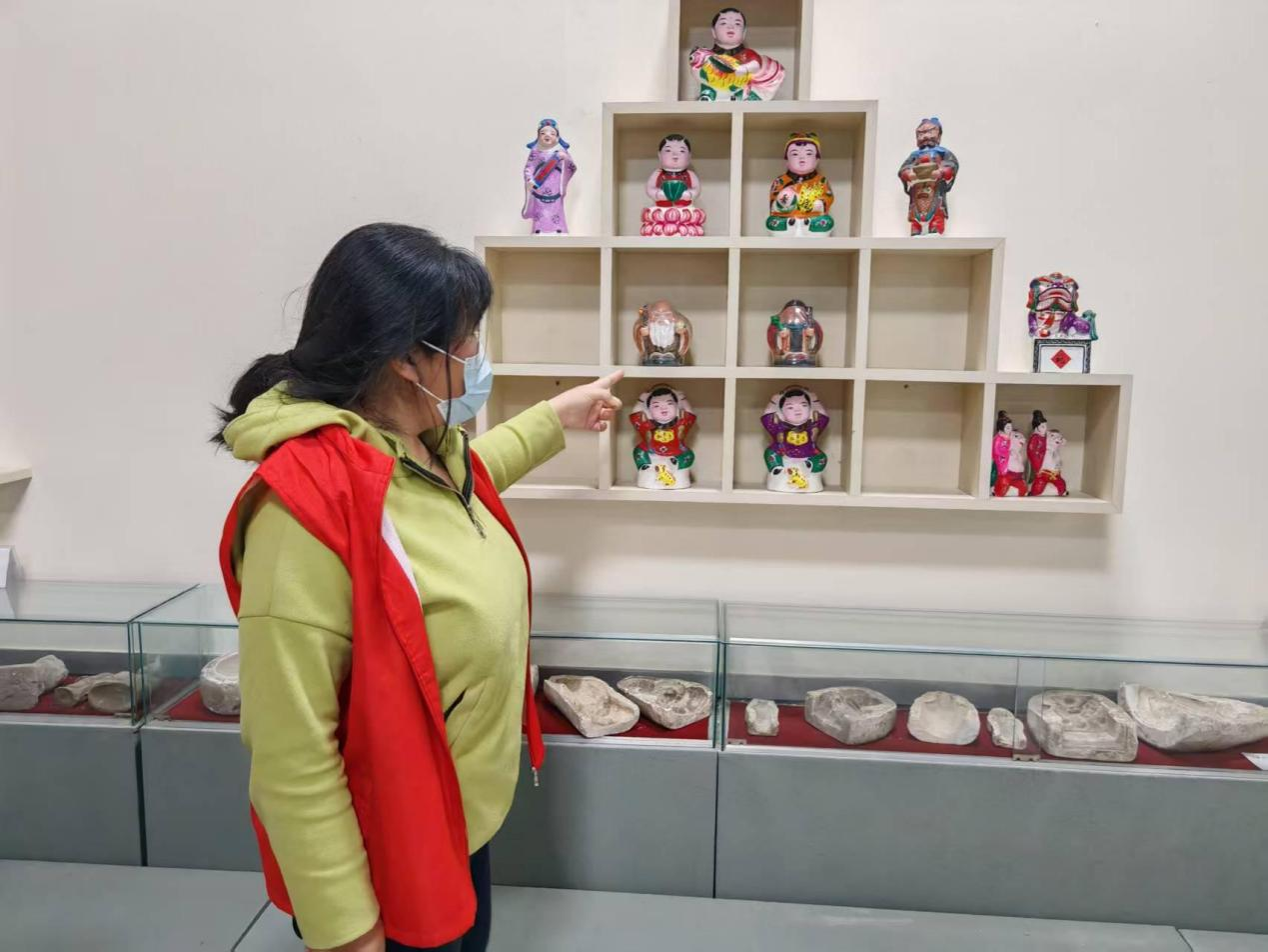 在泥塑展台前,各类泥塑作品散发着泥土的质朴气息。工作人员向实践队员们介绍,这些泥塑从选土、捏制到彩绘,皆为手工完成,匠人们巧手塑造出神话人物、家畜家禽等造型,每一处纹理、每一抹色彩都倾注心血,生动反映当地农耕生活与民间信仰,是地域文化鲜活的“代言人”。这些泥塑造型各异,充满了生活气息,从传统的神话人物到现代的生活场景,无不展现出民间艺人对生活的热爱和对艺术的执着追求。实践队员们通过与文化馆工作人员的交流,深入了解到了泥塑的制作流程和技巧,对这一非遗项目有了更深入的认识。