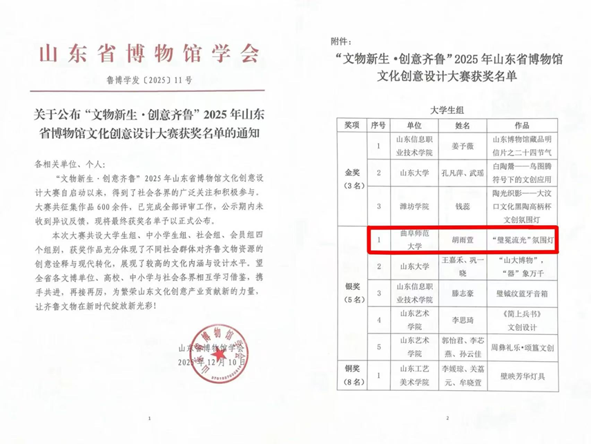 大赛以文物为创作载体、以创意为发展引擎,面向全校征集兼具文化内涵、艺术价值与市场潜力的文创设计作品,搭建高水平文化交流与创意展示平台,大赛采用线上评选的方式,共两百余人参赛,参赛选手来自多个学院。选手们的作品精彩纷呈。经过激烈角逐,选出一等奖两名,二等奖六名,三等奖十名。同时,一名选手的作品荣获山东省银奖。面对本次文创大赛,同学们展现出极高的参与热情,纷纷化身文化传播者,用作品诠释创意。