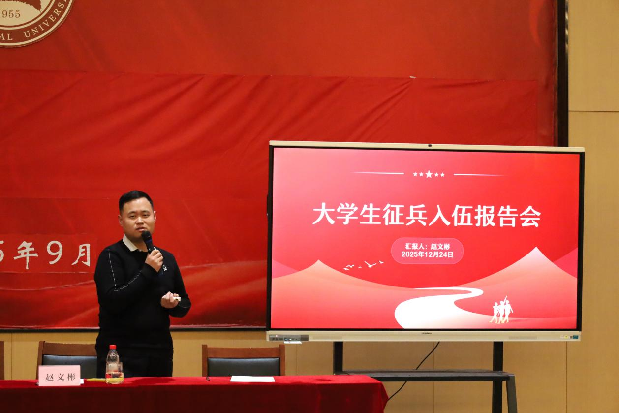 本次大会邀请了学生工作处武装部军事教研室主任、外国语学院团委书记赵文彬老师。会上,赵文彬详细解读了本次征兵政策要点,包括征集对象条件、报名流程、体检标准等核心内容,重点介绍了大学生入伍学费减免、学籍保留、就业优待、经济补助等优惠政策,并结合典型案例分享了参军成才的励志故事,让在场青年对军营生活和征兵政策有了更直观的认识。