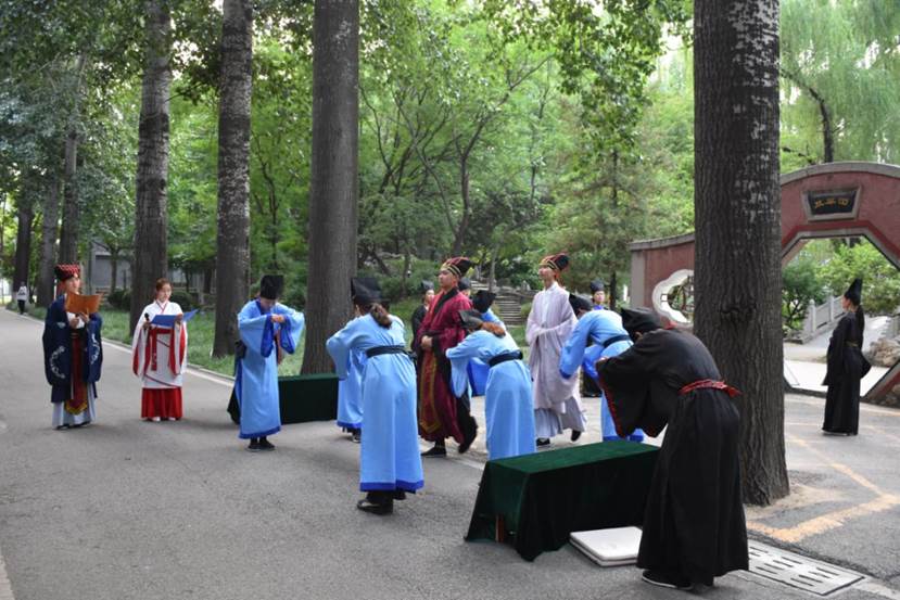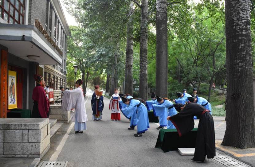 在直播中国云体验课程中,成人短视频 传统礼仪研修中心大学生礼仪队的队员们身着汉服、头戴儒冠,为全球学员献上了一场精彩的“束脩礼”展演。俗语云:“生我者父母,教我者师傅”,该礼仪展演以“尊师重道,明礼求学”为主题,再现了正衣冠、诵读《束脩告文》、献戒、执束脩、训诫、礼敬师儒等场景。观看完毕后,成人短视频 院长成积春教授、指导教师骆明老师还与线上参加直播学习的中外学员进行了实时互动,对学员们提出的问题进行了详细而深刻的解答。