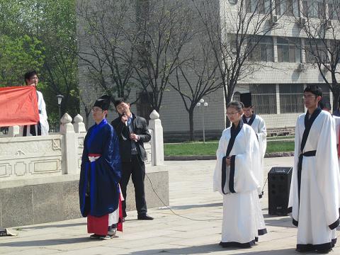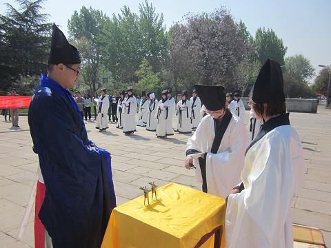 本次大学生成人礼活动分为三部分。首先,活动参加者肃立孔子像前,面谒先师,行成人之礼。在典雅的古琴声中,学生代表按照传统男生加冠、女生加笄(仪式分一加,一醴,三拜);之后全体参与者宣读誓词;随后,巩宝平老师对本次活动作简要总结,并对以后举办类似活动提出殷切期盼;最后,全体师生齐聚孔子像前合影留念,活动圆满落幕。