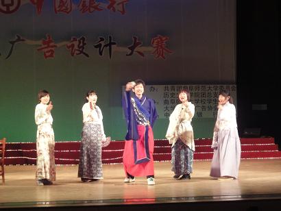 一段动感十足的开场舞拉开了本次决赛的序幕,决赛共分两个环节:平面广告秀和广告真人秀。在“平面广告秀”环节中,各参赛队伍均围绕着“中国银行校园淘宝卡”的主题设计广告,以PPT、FLASH和DV等形式表现各自富有创意的构思;在“广告真人秀”环节中,各参赛队伍的作品均围绕着校园生活展开,以话剧、小品等形式加以呈现,内容均涉及了中国银行校园淘宝卡,选手们所展示的贴近生活的节目、多才多艺的演出以及独具匠心的表现方式,赢得了在场观众的阵阵喝彩。穿插在比赛过程中的抽奖环节,点燃了观众们的参与热情,较好地调动了活动现场气氛。经过激烈角逐,来自成人短视频 的“淘宝家族”组合以261.2分荣获第一名。最后,由成人短视频 吕厚轩老师做了点评,他指出,同学们的广告设计均富有创意和感染力,希望同学们能再接再厉创造更多更好的作品。