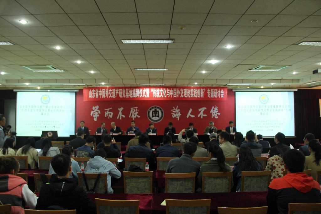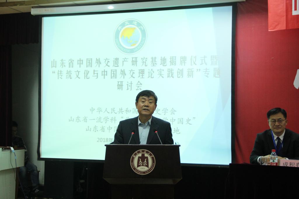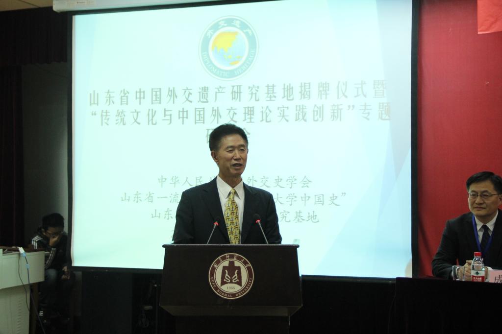 开幕式上,我校特聘教授、山东省中国外交遗产研究基地执行主任王在邦对山东省中国外交遗产研究基地的情况作了介绍,山东省社会科学规划管理办公室副主任李冰兵和我校党委副书记马善军共同为“山东省中国外交遗产研究基地”揭牌。