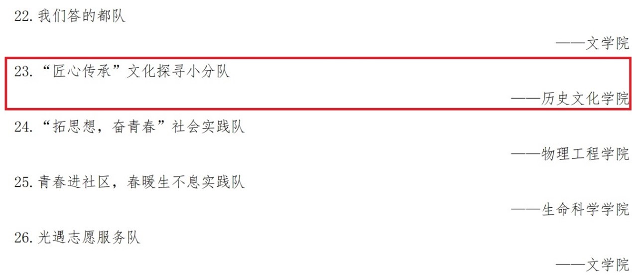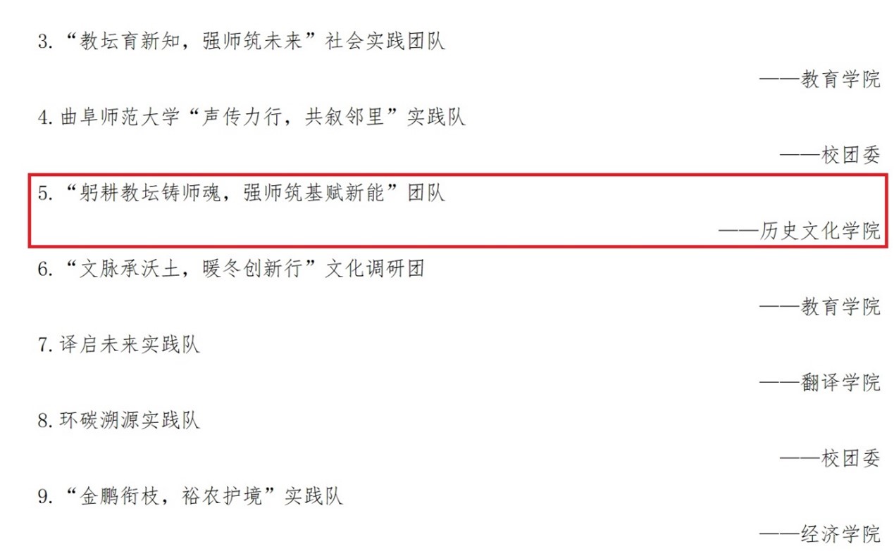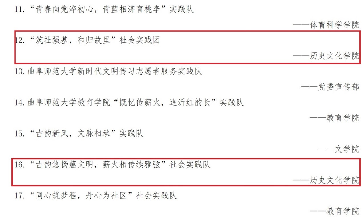 “儒学e路行”实践队、“情系社区,笃学尚行”实践队、绘梦筑基实践队、“青云暖冬,孔哲被泽”社会实践队、“匠心传承”文化探寻小分队、“出巷寻旅,永结馨言”社会实践队