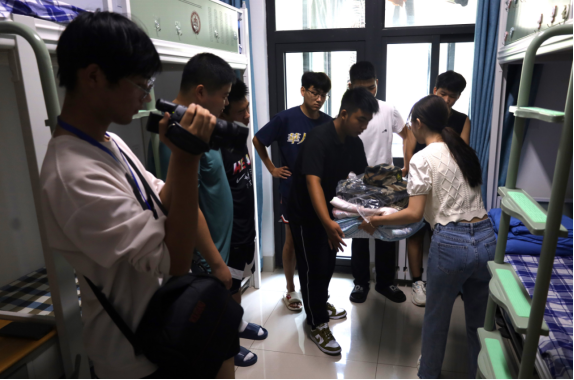 为了能让2024级新生能够尽快适应大学住宿生活,9月1日上午,成人短视频 辅导员董经和闫浩老师以及宿管部志愿者进入宿舍关心帮助成人短视频 新生。
