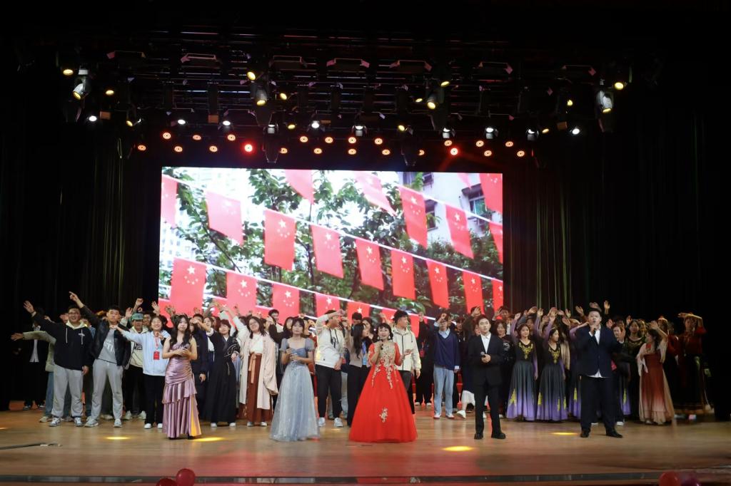 本次晚会内容丰富,形式多样。晚会在一段充满活力的视频中缓缓开幕,视频记录了2024级新生的美好瞬间,展现了新生们对大学生活充满向往的奋发面貌。在激情四射的开场舞调动起全场的热情后,晚会正式开始。随后进入第一幕“历”耕杏坛,小品《先生请出山》带我们再次回顾了“三顾茅庐”的历史,领略到古人的智慧与坚持。张松伟老师献唱的歌曲《祝福祖国》让所有人在悠扬的歌声中加深了对祖国母亲的爱。在第二幕踔“历”奋发中,话剧《亮剑》以生动传神的表演再现了先辈为革命胜利而奋斗的坎坷与决心。相声《礼仪漫谈》让大家在欢乐的氛围中增进了对礼仪文化的认识。第三幕砥“历”前行,歌曲串烧的表演者们声情并茂,各展风采,展现了大学生的青春活力与无限创造力,为我们带来一场精彩的视听盛宴。最后,师生合唱《我爱你中国》,昭示本次迎新晚会的圆满落幕。晚会结束后,演职人员上台合影留念。