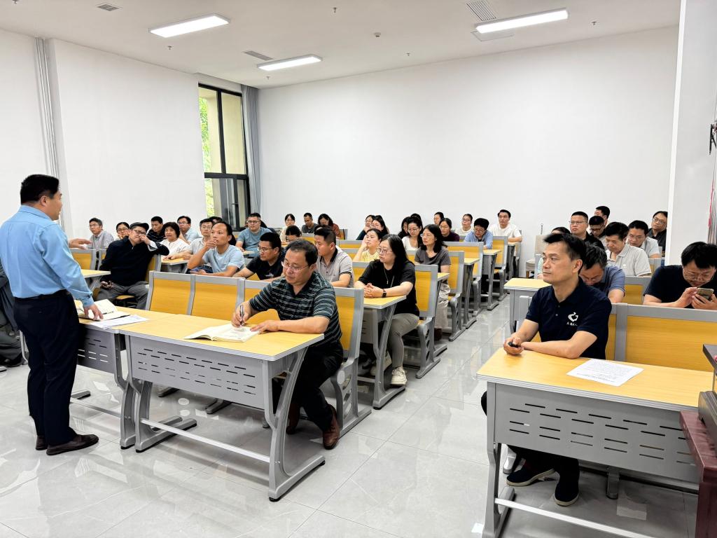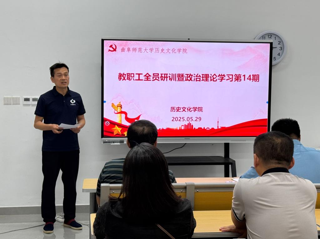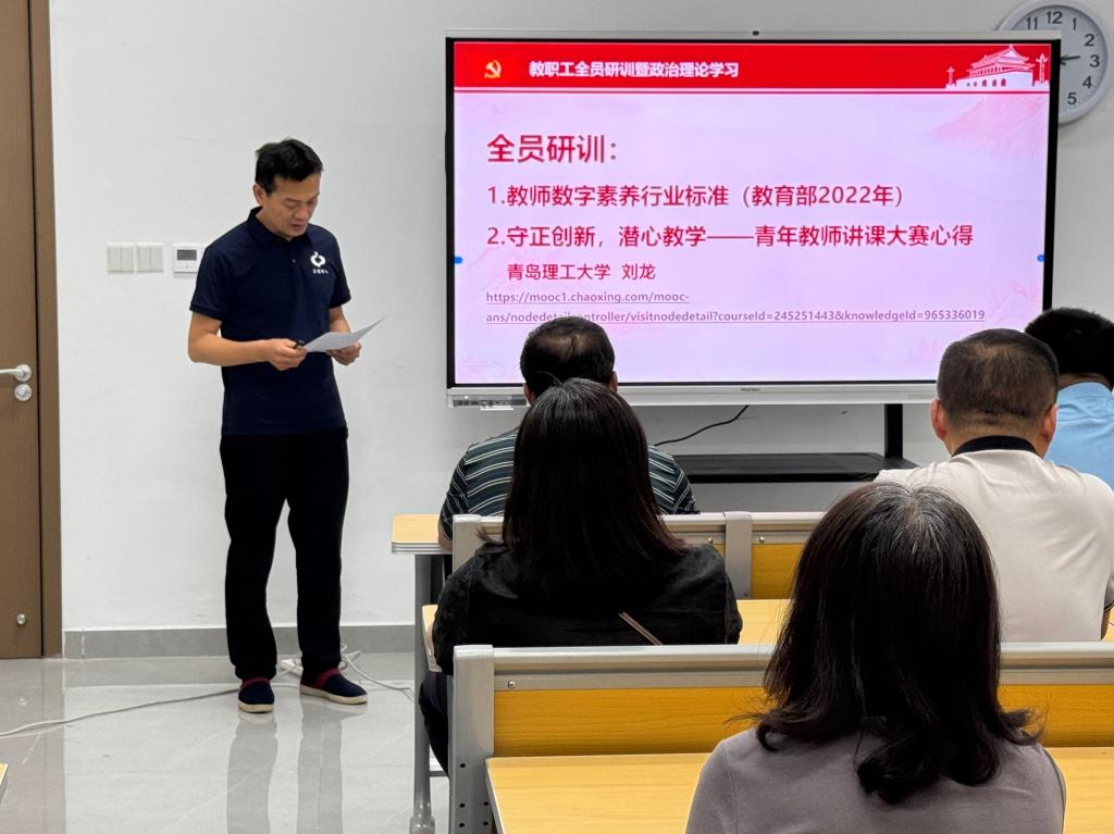 2025年5月29日下午,成人短视频 在孔子书院B120教室举行教职工全员研训暨政治理论学习第14期活动。活动由学院副院长王京传主持,学院党委学习委员孙锋领学,在校教师近60人参加研训。