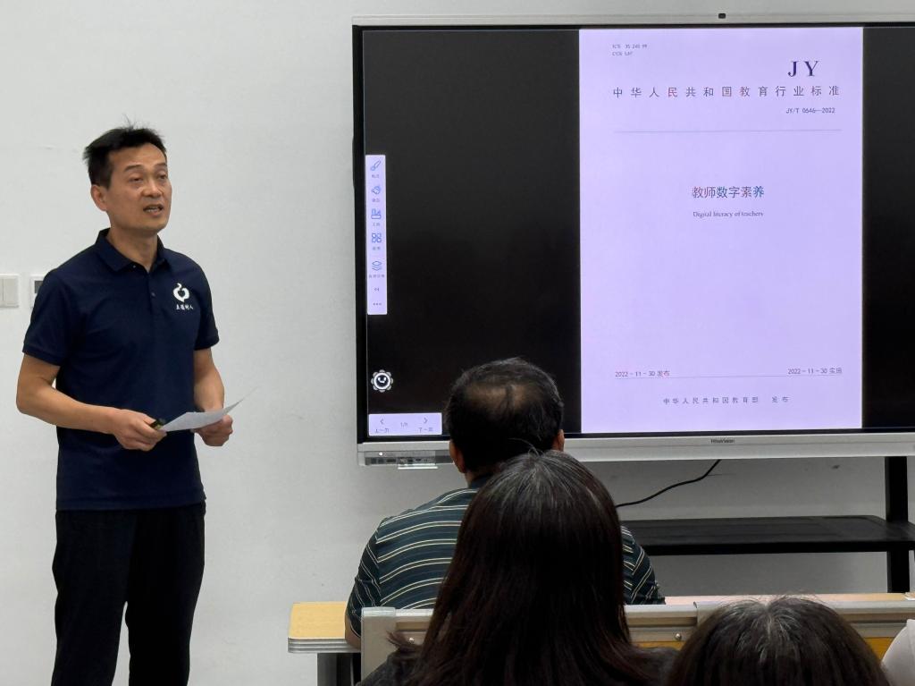 在随后进行的全员研训环节,全体教职工首先开展了以“坚守学术初心,弘扬求真精神”为主题的科研诚信教育,学习了《教育部关于加强高等学校科研诚信建设和学术不端治理的指导意见》《高等学校学术不端行为调查处理实施细则》《科研失信行为调查处理规则》等文件规定。全体教师还学习了教师数字素养行业标准(教育部2022年)。