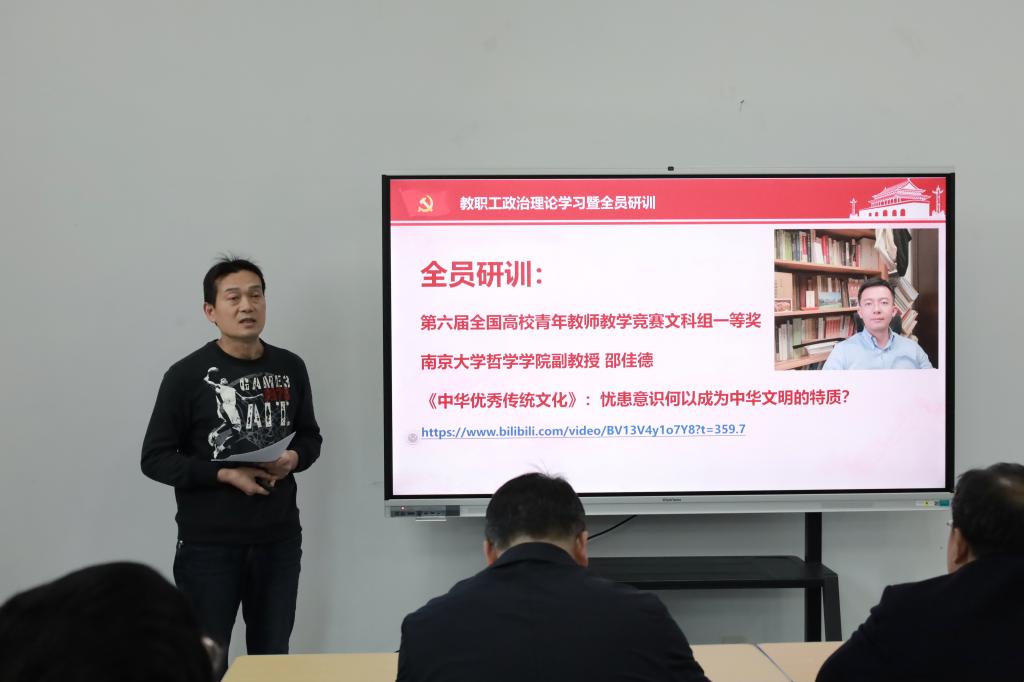 全员研训环节,全体教职工集体观看第六届全国高校青年教师教学竞赛文科组一等奖获得者、南京大学哲学学院邵佳德副教授的参赛视频《中华优秀传统文化》教学节段“忧患意识何以成为中华文明的特质?”。视频中,邵佳德副教授凭借扎实的理论功底、新颖的教学设计和生动的课堂表达,深入剖析了忧患意识作为中华文明特质的历史渊源与当代价值,其巧妙的课程思政融入方式让在场教职工深受启发。大家表示,将借鉴优秀教学经验,优化自身教学设计,提升课堂教学质量,更好地将中华优秀传统文化融入教学实践。