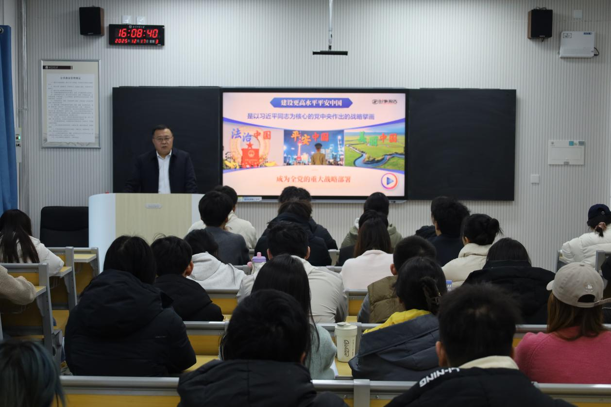 陈丙波以“聚焦建设更高水平平安中国”为题,分别从“发展之基民之所盼,深入探讨时代发展的现实根基与人民期盼”、“成果亮眼成绩显著,全面展示各领域取得的突出成就与进展”、“总体谋划一体部署,系统阐释新时代发展的战略布局与实施路径”三大维度,系统阐述了建设更高水平平安中国的战略意义、实施路径和时代价值。授课中,陈丙波紧密结合国际形势和时事政治,系统分析了当前国家安全领域面临的严峻形势,陈丙波提到,新时代的青年大学生肩负着守护国家安全、传承安全文化的重要使命,希望同学们能够深刻理解建设更高水平平安中国的意义,学思践悟总体国家安全观,为建设更高水平平安中国汇聚磅礴的青春力量。