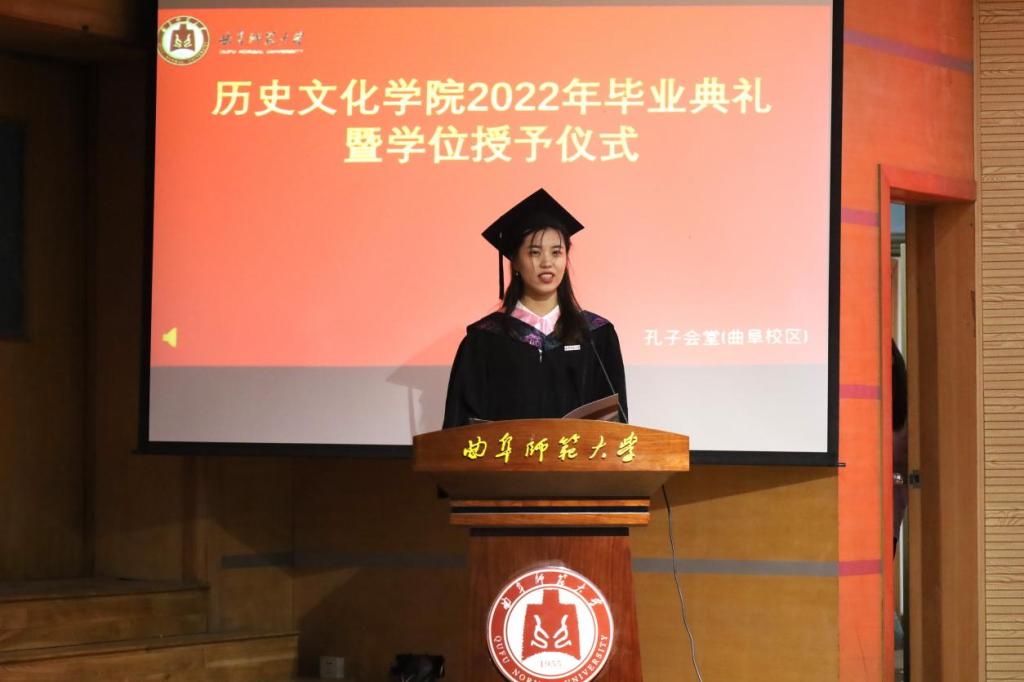 本科毕业生代表张晓帆同学发言。她分享了自己在大学收获的成长和蜕变,感恩学校提供的学习资源、实践机会和育人环境。希望全体毕业生把曲园人求真、求新的文化基因撒遍祖国大地,并将其转化成克服困难、走向未来的勇气和力量,脚踏实地、砥砺前行,用自己的行动和成绩为母校增添新的荣光。